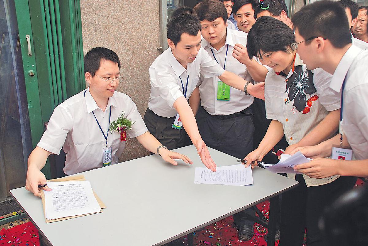 2007年6月22日,郵儲銀行第一位小額貸款客戶董景蓮(右二)辦理借款手續(xù)。