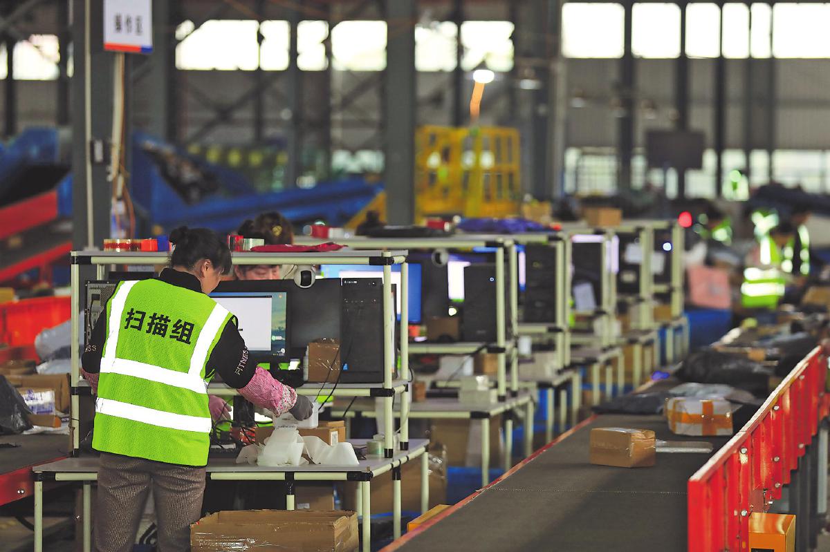 工作人員將入庫后的郵件逐件掃描換單,一件件貼上郵政面單的包裹將通過專車發(fā)往新疆?! 蹴n穎 攝