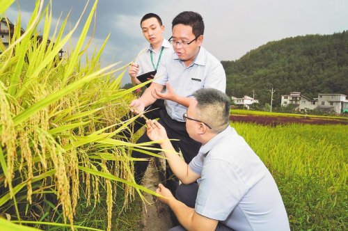 重慶分行工作人員與楊聰(中)一起在“稻香童年”田園綜合體考察水稻生長情況。