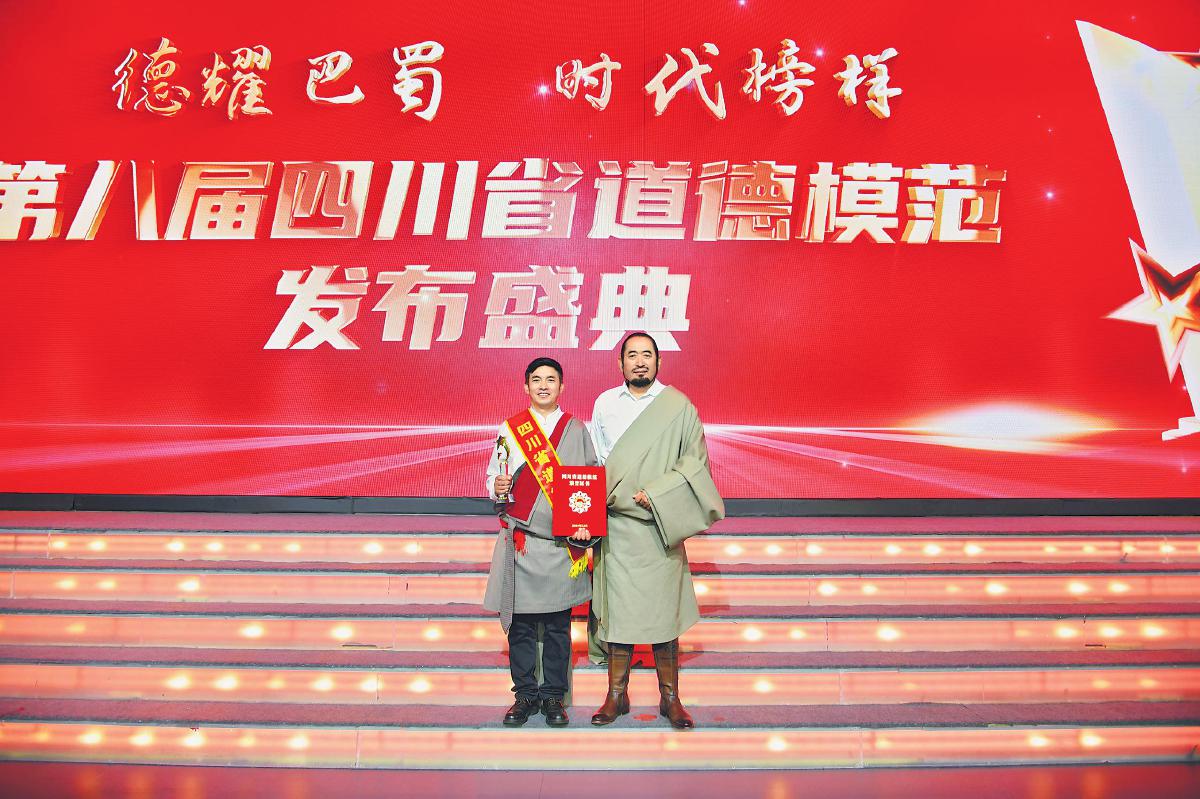 12月21日,第八屆四川省道德模范發(fā)布盛典在成都舉行,評(píng)選出助人為樂、見義勇為、誠實(shí)守信、敬業(yè)奉獻(xiàn)、孝老愛親5個(gè)類別共50名道德模范,若爾蓋縣郵政分公司網(wǎng)運(yùn)投遞班組長(zhǎng)哈弄奪機(jī)獲評(píng)“敬業(yè)奉獻(xiàn)”道德模范。在活動(dòng)現(xiàn)場(chǎng),時(shí)代楷模、全國勞模、四川省甘孜縣郵政分公司長(zhǎng)途郵車駕駛員其美多吉作為頒獎(jiǎng)嘉賓為哈弄奪機(jī)頒獎(jiǎng)。