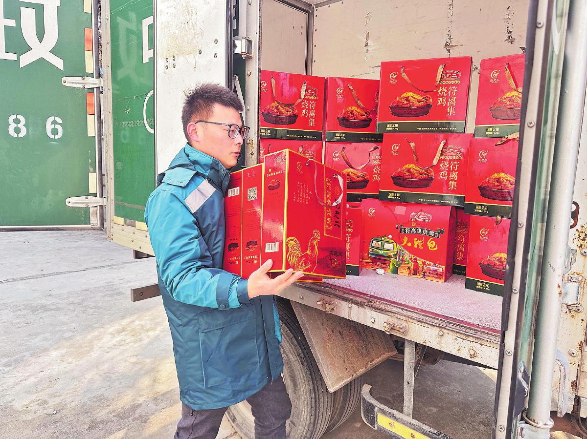 寄出的是年貨,收到的是牽掛。在距離歙縣500多公里的宿州市符離集劉老二燒雞有限公司,1月2日上午10點,宿州市郵政分公司攬投員劉闖正在將一盒盒寄往外地的符離集燒雞搬上郵車。