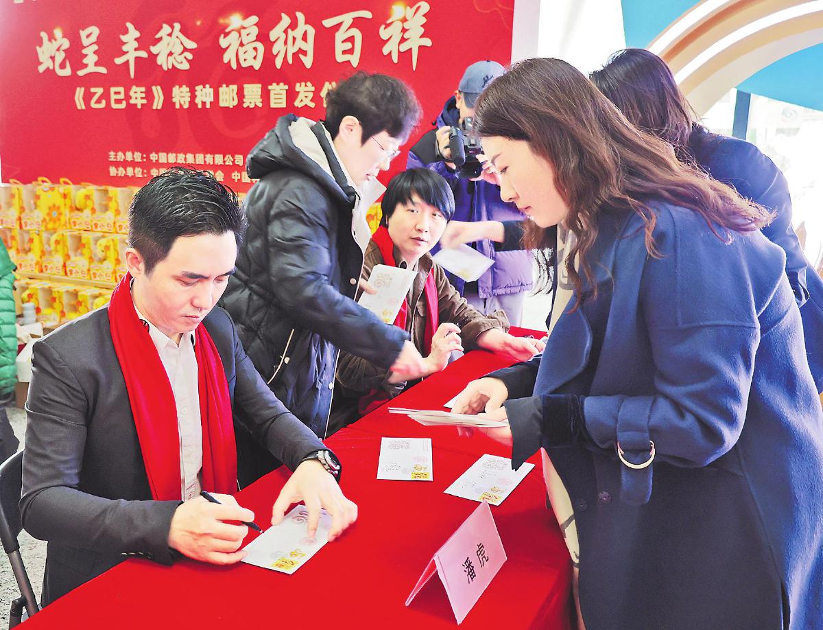 《乙巳年》特種郵票設(shè)計者潘虎、張旺在首發(fā)式現(xiàn)場簽售?!趵钗 z