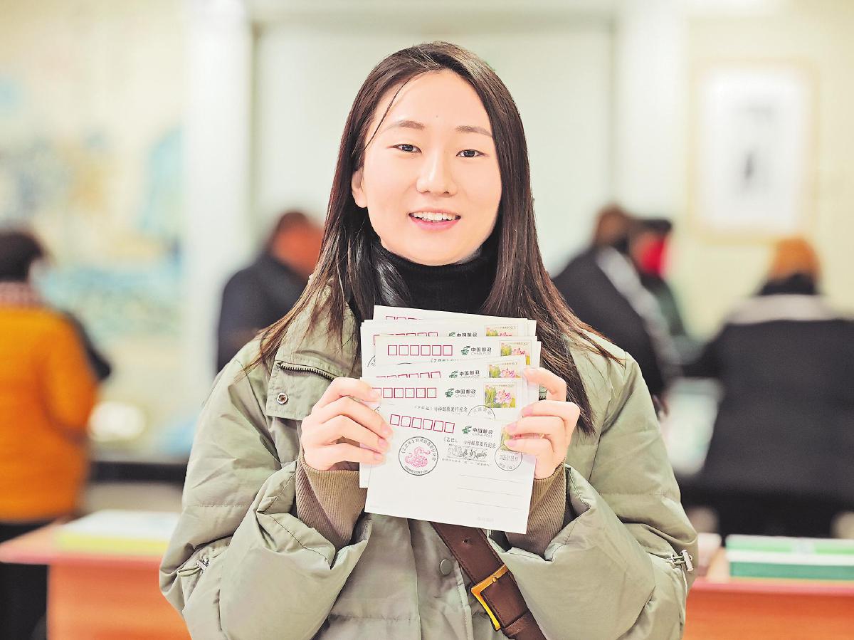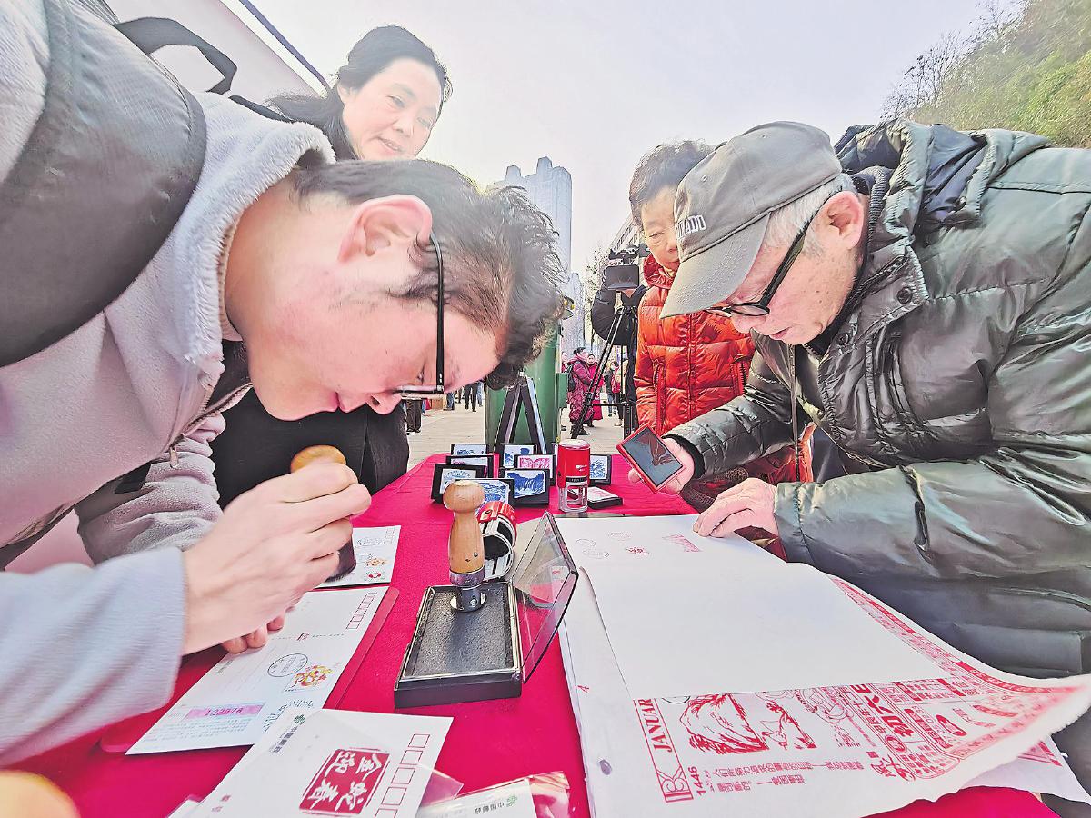 河南省南陽市郵政分公司多個網(wǎng)點聯(lián)動開展生肖蛇票發(fā)行活動,啟用《乙巳年》特種郵票發(fā)行紀(jì)念戳和蟒泉臨時郵局紀(jì)念戳,免費為廣大集郵愛好者加蓋。在南陽市仲景路集郵專賣店,郵迷捧著加蓋郵戳的紀(jì)念封欲寄給親朋好友,傳遞新年祝福?!鮿⒘P 攝