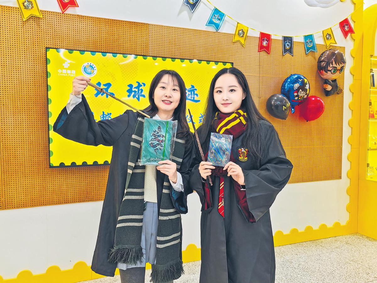 近日,環(huán)球郵跡集郵旗艦店在北京建國門郵政支局正式開業(yè)。該旗艦店內(nèi)設(shè)立外國郵票展示區(qū)、文化活動區(qū)、產(chǎn)品銷售區(qū)和郵文化交流區(qū),展示、銷售來自世界各地的郵票,為集郵愛好者提供了一個全新的交流平臺。圖為郵政工作人員在店內(nèi)展示中國集郵與全球知名文化IP哈利·波特聯(lián)名推出的《蛇愿》生肖郵票珍藏套裝產(chǎn)品。