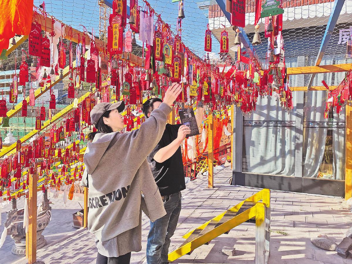 游客在郵局專門設(shè)置的祈福區(qū)掛上許愿牌。