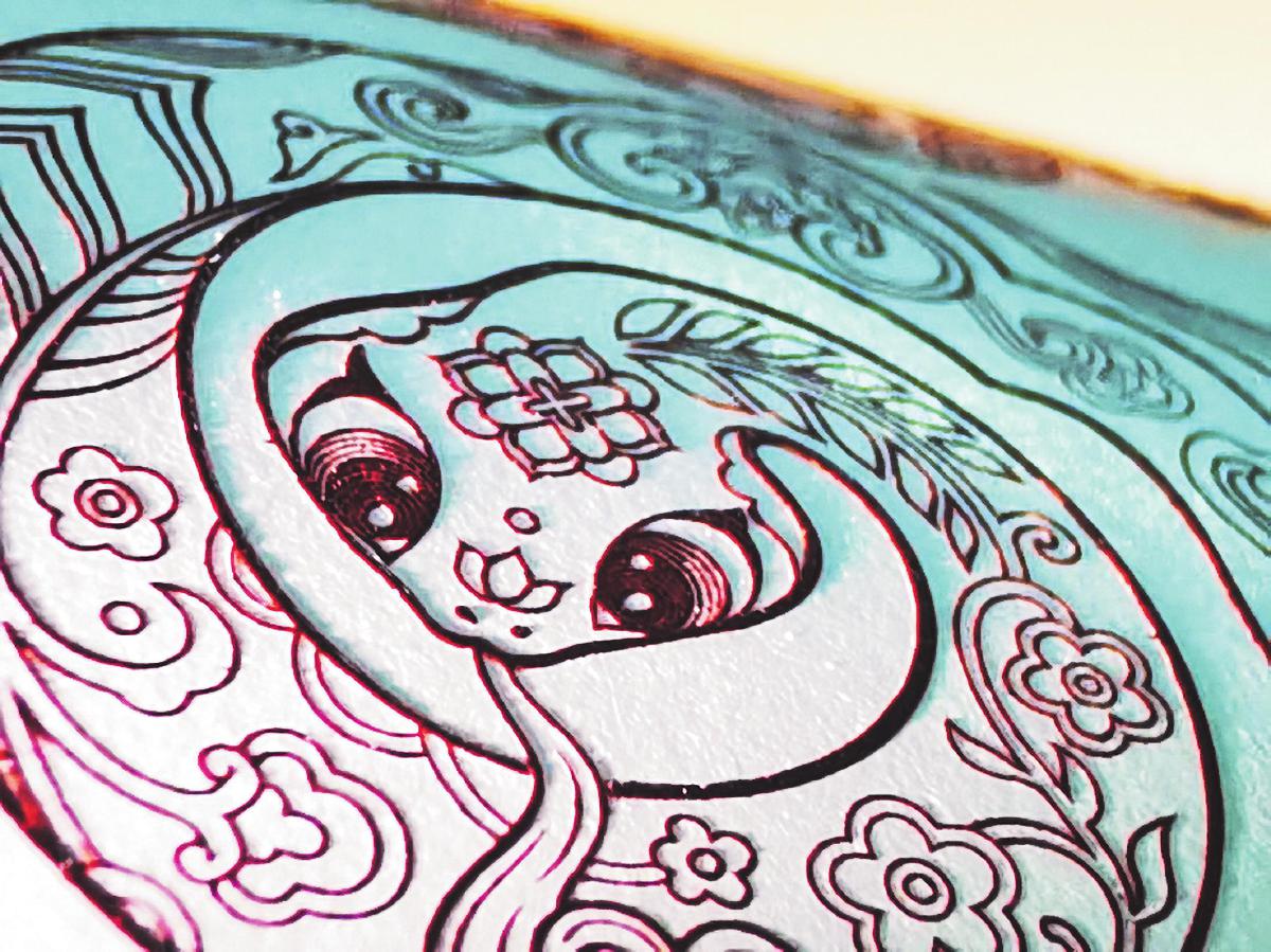 優(yōu)秀的印制質(zhì)量離不開優(yōu)秀的原材料。在此次生肖郵票的印制中,北京郵票廠首次使用了新研發(fā)的觸感雕刻油墨。雕刻油墨顏色更深更亮,觸感更明顯。用放大鏡觀察《乙巳年》特種郵票中的雕刻線條,可以看到繪畫筆觸似的刀鋒,用手指在紙上輕輕撫摸時(shí),圖像輪廓有明顯的凸起感。