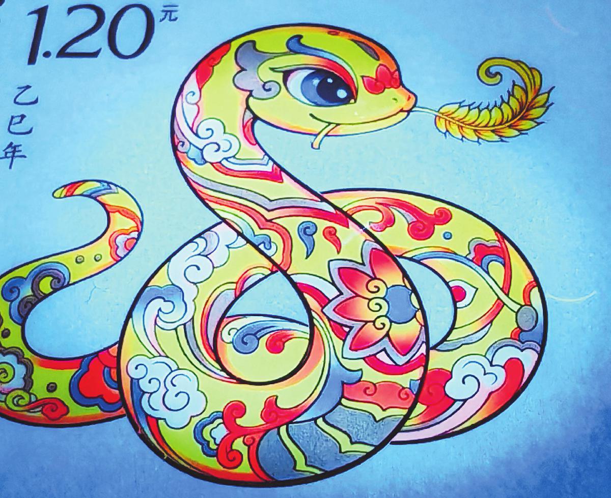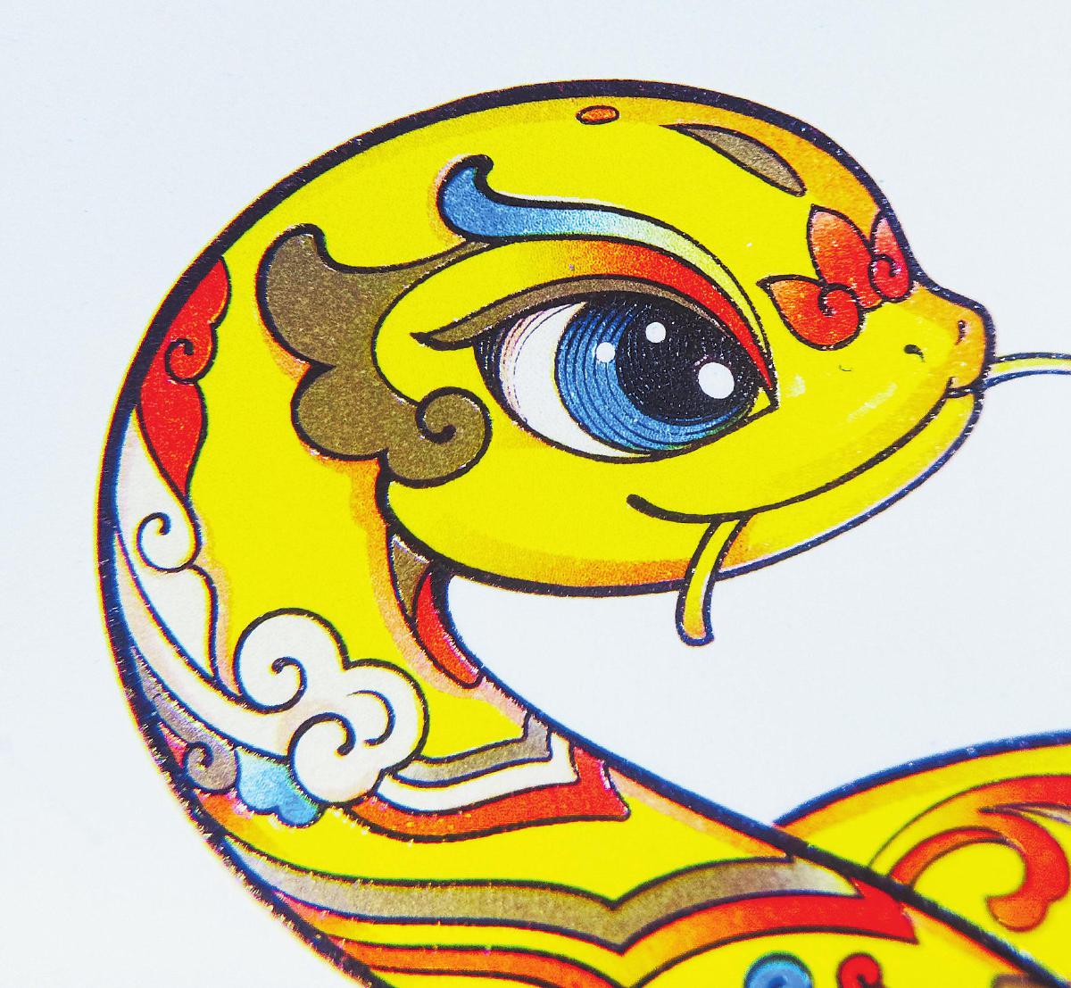 在該套郵票的工藝設(shè)計(jì)方面,北京郵票廠沿襲第四輪生肖郵票的整體工藝設(shè)計(jì)思路,采用膠雕聯(lián)合印刷方式,使用六色高精度膠印以及由雕刻師采用獨(dú)特的中國(guó)畫白描技法配合特種棕色雕刻工藝印制。其中,在雕刻布線時(shí)使用中國(guó)畫白描技法,線條的描繪準(zhǔn)確而流暢,顯著提升圖案的整體精細(xì)度和藝術(shù)感。在第一枚“蛇呈豐稔”中,通過中國(guó)畫白描技法的精細(xì)描繪,蛇和“嘉禾”這一形象更加醒目、突出,寓意著豐收和富足。在第二枚“福納百祥”中,蛇身構(gòu)成的“?!弊滞ㄟ^中國(guó)畫白描技法得到了更加細(xì)膩的描繪,變得更加清晰、立體,寓意著團(tuán)圓和幸福。采用國(guó)際先進(jìn)的激光雕刻機(jī)刻版,通過線條的粗細(xì)、深淺變化,表現(xiàn)出圖案的層次感和立體感,使得郵票圖案中的蛇身、蛇鱗以及周圍的裝飾元素都得到更加生動(dòng)的呈現(xiàn),整個(gè)畫面因此更加飽滿、立體。