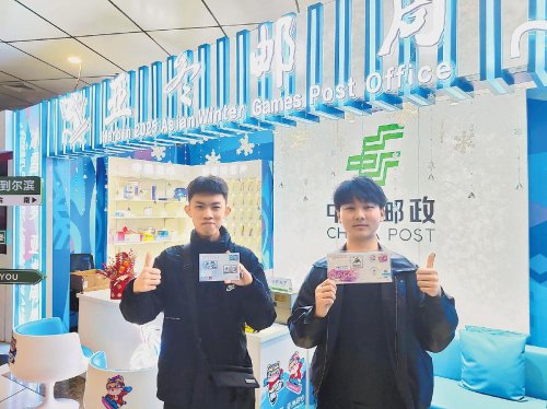 “我剛剛選了一套單板滑雪的紀(jì)念郵票和亞冬會(huì)倒計(jì)時(shí)50天紀(jì)念郵資封。因?yàn)楹軜s幸被選為亞冬會(huì)志愿者,我覺(jué)得應(yīng)該留下一些值得紀(jì)念的東西,正好看到了亞冬會(huì)郵局里的產(chǎn)品特別精美,也特別契合這次亞冬會(huì)的主題,很有意義?!备咧猩驹刚邊挝牟╅_(kāi)心地說(shuō)。而他的同學(xué)在看到他手中的紀(jì)念郵品時(shí)也很喜歡,在呂文博的指引下來(lái)到郵局購(gòu)買(mǎi)了幾枚明信片。郵政工作人員得知他是為了收藏紀(jì)念,特意為他選了精美的郵戳加蓋在明信片上。