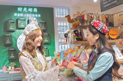 走進(jìn)大巴扎主題郵局,琳瑯滿目的文創(chuàng)產(chǎn)品吸引了眾多游客駐足觀賞、購買。整面墻的新疆風(fēng)光明信片和醒目的“時光郵局”4個字最先抓住游客的眼球。來自全國各地的年輕人將對未來的期待、對生活的感悟、對親人的思念,寫在信紙上裝入信封,投入“時光郵局”的信箱,寄給未來的自己,充滿儀式感。
