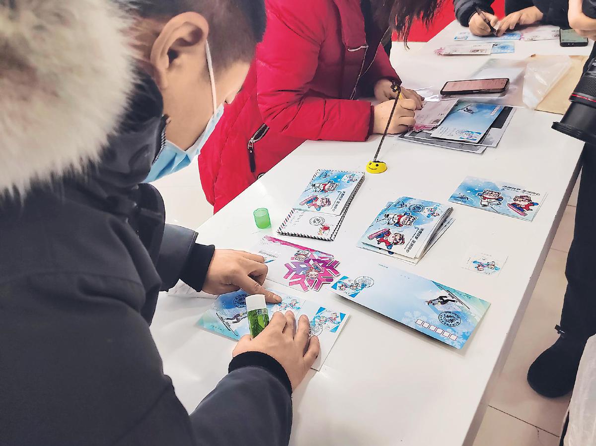 集郵愛好者在亞冬會紀念郵票首發(fā)現(xiàn)場自制首日封?! 鯊埖さぁz