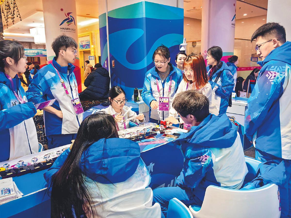 亞冬會志愿者在北大荒運動員村主題郵局打卡留念?!鯀菚蕴臁z
