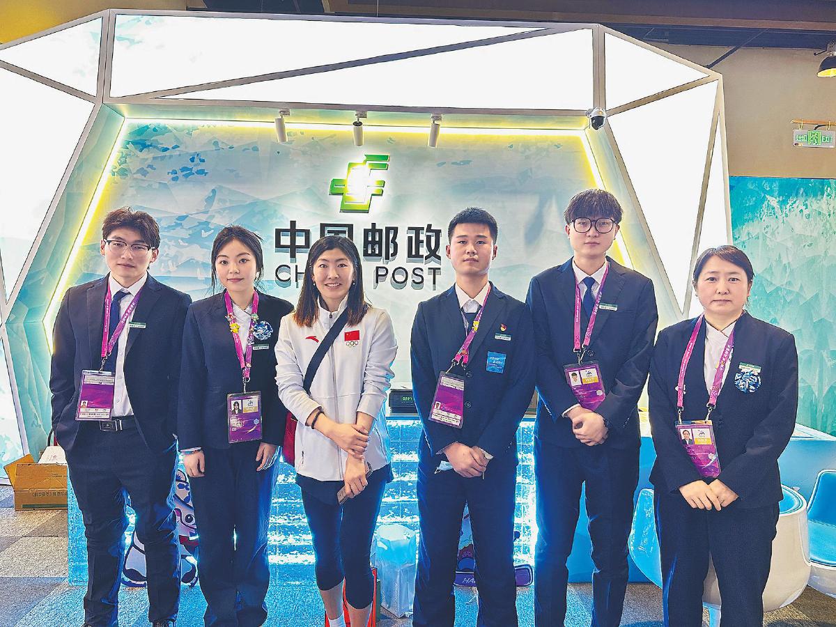 中國雪上項目首位全滿貫獲得者、本屆亞冬會自由式滑雪女子空中技巧項目冠軍徐夢桃(左三)在雅旺斯主題郵局郵寄包裹后,與郵政員工合影留念?!跄呤佬邸z