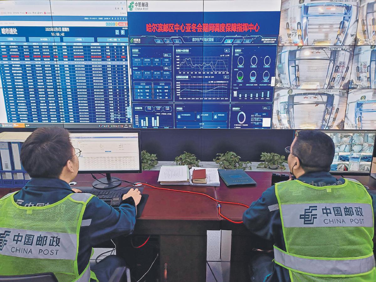 郵政工作人員在監(jiān)控室護航亞冬會郵件安全?!趿_輝 攝