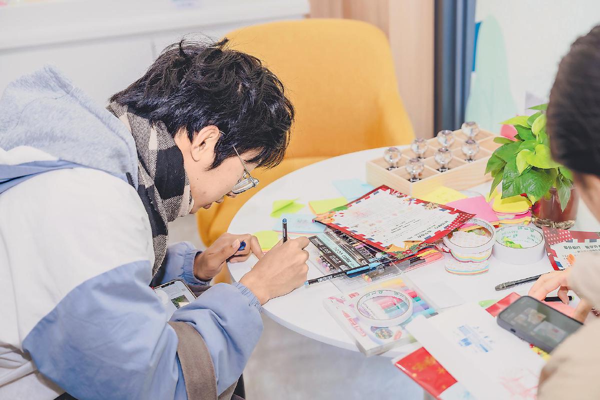 江南大學(xué)的學(xué)生在校園郵局加蓋特色郵戳、書(shū)寫(xiě)明信片,享受“郵文化”樂(lè)趣。