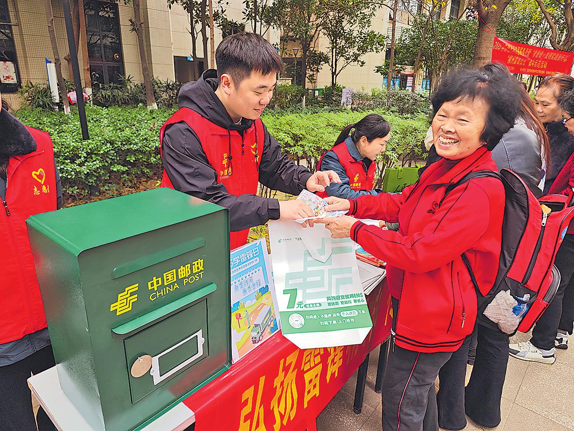 3月4日,廣西壯族自治區(qū)柳州市郵政分公司參加了在長林社區(qū)冠亞尚成國際小區(qū)舉行的學雷鋒志愿服務活動。當天,柳州市分公司設立了專門的服務攤位,為附近的居民贈閱報刊和免費郵寄明信片,吸引了眾多居民前往參與?!蹒姌I(yè)榮 攝影報道
