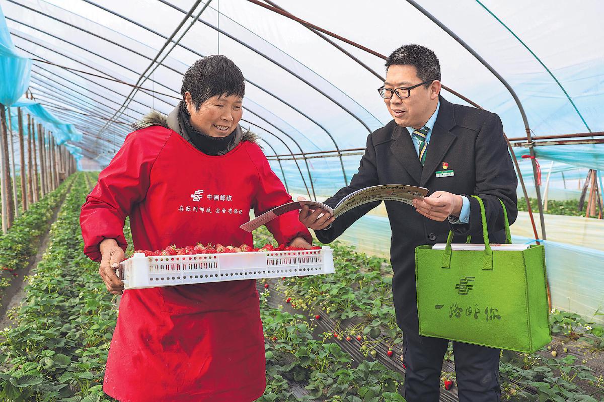 眼下正是草莓上市的關(guān)鍵時(shí)期,湖北省襄陽(yáng)市郵政分公司主動(dòng)做好“三農(nóng)”服務(wù),聚焦草莓產(chǎn)業(yè)鏈發(fā)展,聯(lián)合當(dāng)?shù)剜]儲(chǔ)銀行提供惠農(nóng)貸款、銷(xiāo)售、寄遞等一條龍服務(wù),并于日前啟動(dòng)草莓同城配送項(xiàng)目,規(guī)劃生鮮寄遞專(zhuān)門(mén)運(yùn)輸線(xiàn)路,助力特色農(nóng)業(yè)產(chǎn)業(yè)發(fā)展壯大。圖為3月5日,襄陽(yáng)郵政工作人員走進(jìn)大棚,向種植戶(hù)宣講郵政服務(wù)舉措。
