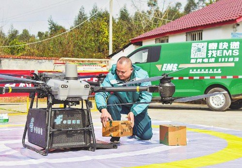 如果說深山高原的無人機(jī)運(yùn)郵是“雪中送炭”,那么城市周邊鄉(xiāng)村的無人機(jī)投遞則是“錦上添花”。在成都,邛崍和彭州兩市相繼開通常態(tài)化無人機(jī)郵路,使輕小郵件“朝發(fā)夕至”,目前累計(jì)投遞報刊6000余份、包裹400余件。在自貢市榮縣,無人機(jī)郵路開通后,涼水井村至高山鎮(zhèn)的郵件雙向流通時間節(jié)約了40分鐘,村民網(wǎng)購的商品和寄遞的土特產(chǎn)實(shí)現(xiàn)高效流轉(zhuǎn)。