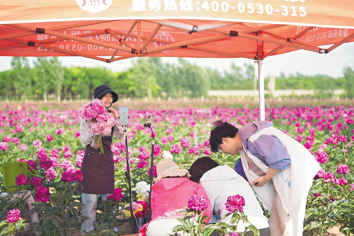 菏澤郵政直播團隊走進種植基地,開展芍藥鮮切花直播?! 踮w現萌 攝