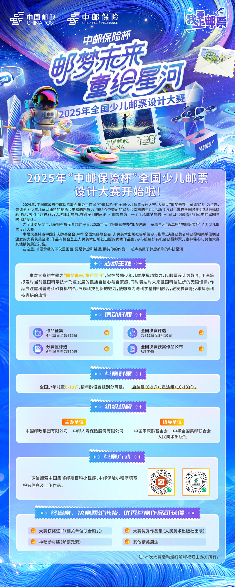 本次大賽的主題為“郵夢(mèng)未來(lái),童繪星河”,旨在鼓勵(lì)少年兒童發(fā)揮想象力,以郵票設(shè)計(jì)為媒介,用畫(huà)筆抒發(fā)對(duì)當(dāng)前祖國(guó)科學(xué)技術(shù)飛速發(fā)展的民族自信心與自豪感,同時(shí)表達(dá)對(duì)未來(lái)祖國(guó)科技進(jìn)步的無(wú)限憧憬。作品應(yīng)注重科普與科幻有機(jī)結(jié)合,展現(xiàn)科技創(chuàng)新的魅力,使想象力與科學(xué)精神相融合,激發(fā)參賽青少年探索科技奧秘的熱情。