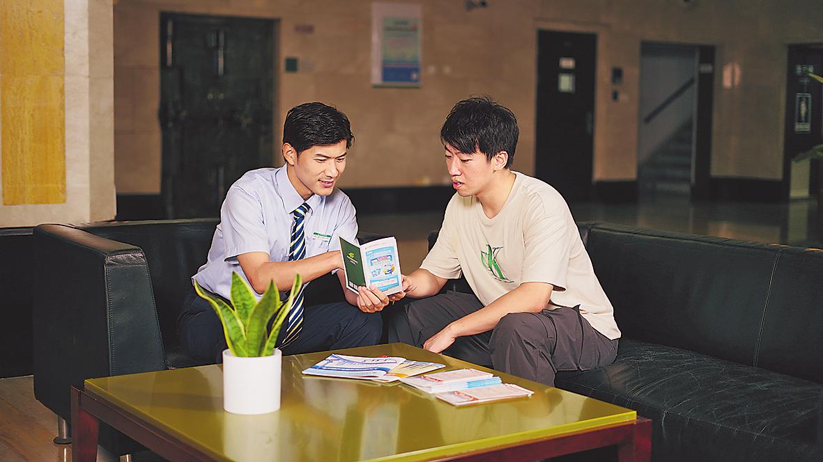黃浦區(qū)支行營(yíng)業(yè)部理財(cái)經(jīng)理為客戶介紹理財(cái)產(chǎn)品。