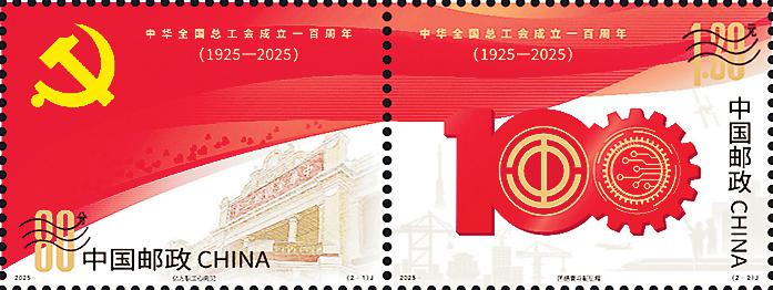 1925年5月1日,中華全國總工會在廣州正式成立。百年來,在黨的領(lǐng)導(dǎo)下,中華全國總工會櫛風(fēng)沐雨,始終與黨同心、跟黨奮斗,前赴后繼、奮勇拼搏,艱苦奮斗、建功立業(yè),譜寫了壯麗的篇章?!吨腥A全國總工會成立一百周年》紀(jì)念郵票圖案采用連票設(shè)計形式,以紅色為主色調(diào)。第一枚“億萬職工心向黨”,以黨徽、中華全國總工會廣州舊址為畫面主體,以意象化的紅旗為背景,并點綴心形圖案,象征中華全國總工會初心向黨,在黨的領(lǐng)導(dǎo)下走過百年光輝歷程。第二枚“團結(jié)奮斗新征程”,將中華全國總工會會徽、齒輪、芯片等與數(shù)字“100”組合設(shè)計,以意象化的紅旗為背景,并輔以城市建筑、港口、高鐵、飛機、火箭、空間站及勞動者等元素,象征著進入新時代以來,中華全國總工會在黨的領(lǐng)導(dǎo)下不斷奮進,為實現(xiàn)中華民族偉大復(fù)興作出更大貢獻(xiàn)。
