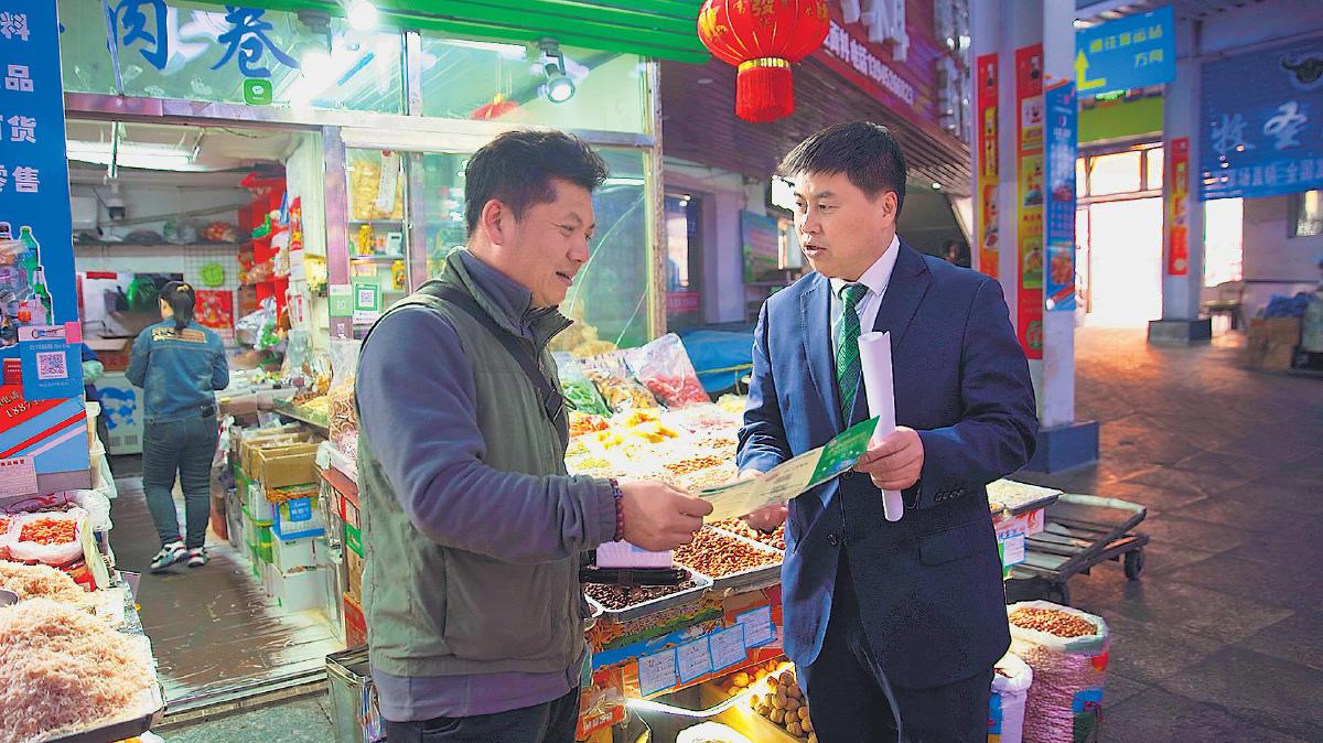 周慶水向網(wǎng)點(diǎn)周邊商戶宣傳業(yè)務(wù)。
