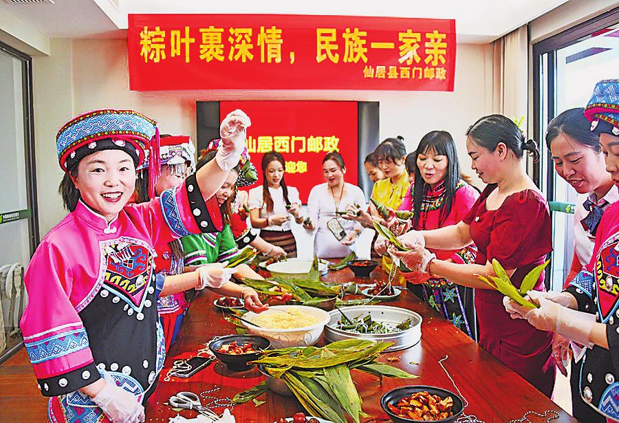 5月24日,浙江省仙居縣郵政分公司西門營業(yè)所聯(lián)合仙居縣政協(xié)少數(shù)民族界別、工會界別,共同開展“粽葉飄香迎端午 民族團(tuán)結(jié)一家親”主題活動?;顒蝇F(xiàn)場,來自苗族、侗族、畬族等10個民族的30余名同胞身著民族盛裝,與郵政員工、政協(xié)委員們共聚一堂,包粽子、迎端午、話家常。