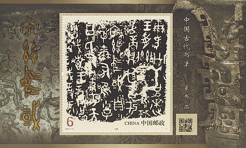 6月21日,《中國(guó)古代書(shū)法——篆書(shū)(二)》特種郵票將發(fā)行。該套郵票一套4枚,小型張1枚。郵票圖案名稱(chēng)為“大盂鼎”“中山王舋鐵足鼎”“石鼓·吾車(chē)刻石”“瑯琊刻石”,小型張圖案名稱(chēng)為“何尊”。
