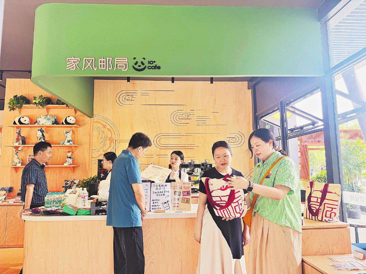游客在熊貓家風郵局選購集郵文創(chuàng)產品。