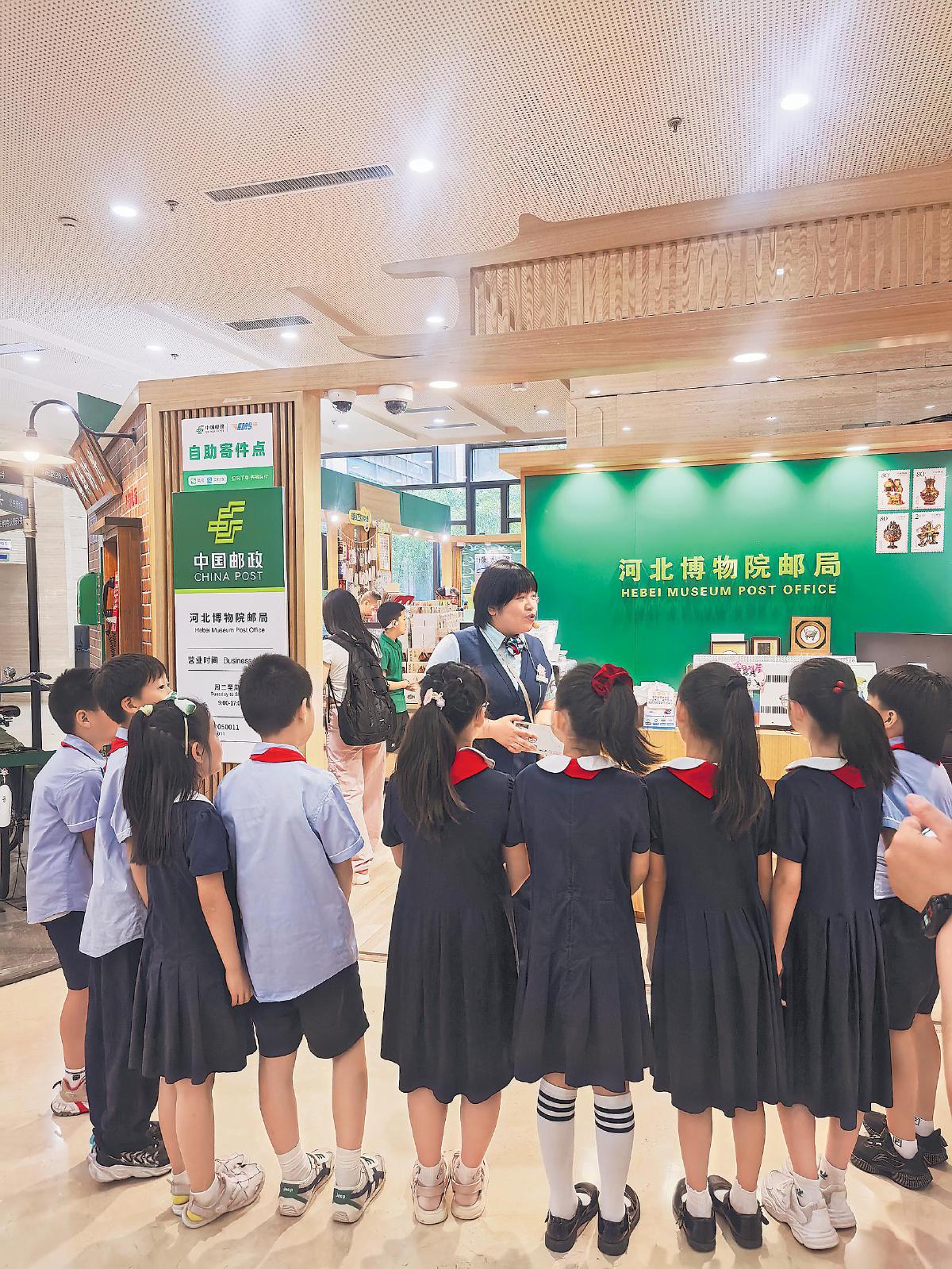 研學(xué)活動(dòng)區(qū),孩子們正認(rèn)真聆聽(tīng)“博物院里為什么有郵局”研學(xué)課程,了解文物與郵票的知識(shí),參與蓋戳、填寫(xiě)明信片并寄出的活動(dòng)。今年以來(lái),河北博物院主題郵局已舉辦10余場(chǎng)研學(xué)活動(dòng),參與人數(shù)突破5000人次。