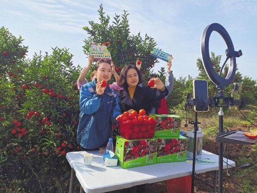 銅梁郵政主播與村干部聯(lián)手在柑橘園內(nèi)開展助農(nóng)直播?! 鯒钛蟆z