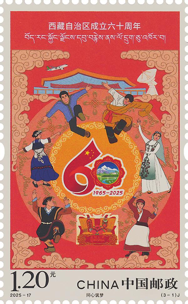 第一枚“同心筑夢”,畫面以西藏自治區(qū)成立60周年慶?;顒踊諛?biāo)為主體,四周環(huán)繞身著盛裝歡慶的各族人民,背景展現(xiàn)了拉薩機(jī)場、C919飛機(jī)、日喀則40米射電望遠(yuǎn)鏡等元素,表現(xiàn)了西藏自治區(qū)成立60年來,各族人民在黨的領(lǐng)導(dǎo)下攜手共進(jìn)、同心同行、民族團(tuán)結(jié)進(jìn)步的和諧畫面。