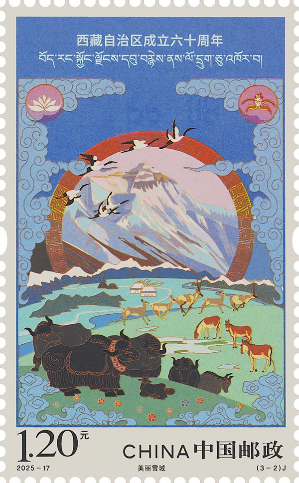 第二枚“美麗雪域”,描繪了漫步、奔跑的牦牛、藏野驢、藏羚羊,飛翔的黑頸鶴,以及陽光映照下的珠穆朗瑪峰等元素,人與自然和諧相處的景象躍然紙上,展現(xiàn)了西藏獨(dú)特的生態(tài)環(huán)境和豐富的生物多樣性,體現(xiàn)出西藏在生態(tài)保護(hù)與生態(tài)文明建設(shè)方面取得的顯著成效。