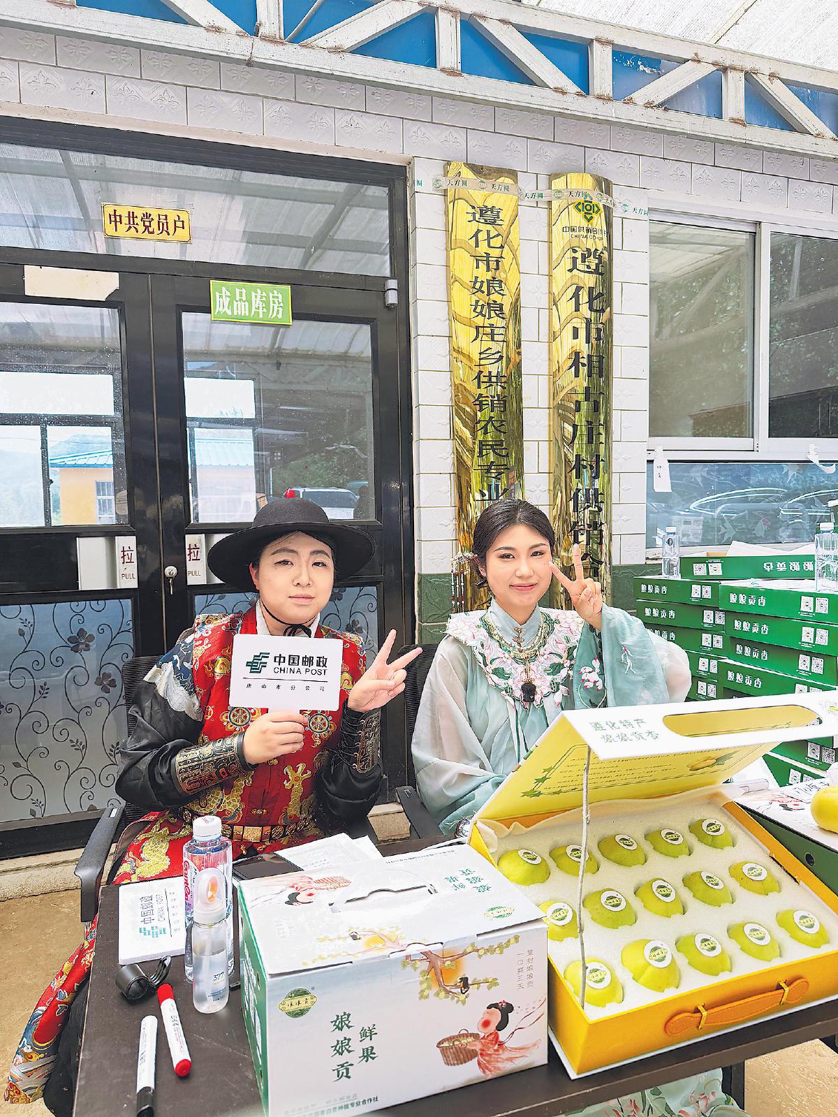 “《遵化州志》中曾記載:遵化東南二十五里,有村名相古莊,盛產(chǎn)銀白杏,因味道鮮美,被定為年貢?!薄跋鄠髟?00年前的明朝,還有一段與香白杏有關(guān)的愛情故事?!敝辈ラg里,主播身著“娘娘裝”,對有關(guān)“娘娘貢”香白杏的歷史記載、文化典故侃侃而談,在她身邊坐著“皇上”和“小黃”。