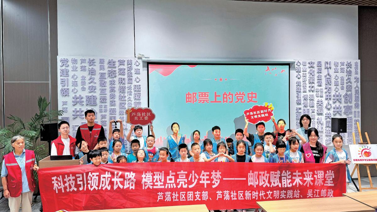 吳江郵政的黨員志愿者通過(guò)一枚枚珍貴的郵票,向社區(qū)的青少年們講述了中國(guó)共產(chǎn)黨從誕生到進(jìn)行革命斗爭(zhēng)再到蓬勃發(fā)展的偉大歷程。