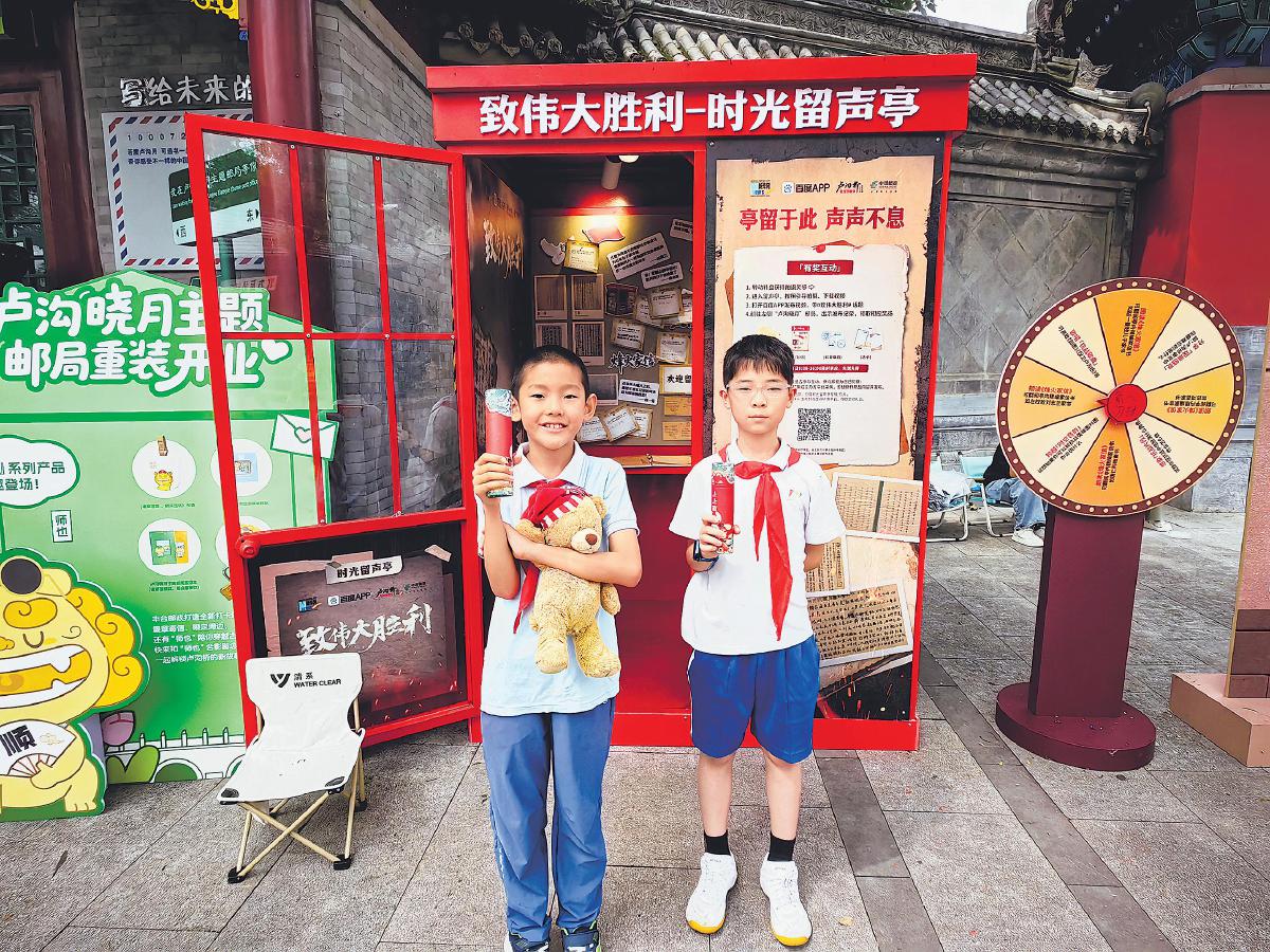 8月15日,“致敬偉大勝利”及烽火家信系列活動在北京市豐臺區(qū)宛平城啟動。該活動由百度App聯(lián)合新華網(wǎng)、軍事博物館、退役軍人事務(wù)部、北京市郵政分公司、盧溝橋文化公園等單位共同舉辦。游客在“致偉大勝利”時光留聲亭旁,轉(zhuǎn)動轉(zhuǎn)盤即可選擇錄制內(nèi)容,包括參觀抗戰(zhàn)展陳的體會、朗讀一封感人的抗戰(zhàn)家書或唱一首經(jīng)典革命歌曲,產(chǎn)生的優(yōu)質(zhì)視頻素材將由權(quán)威媒體整理后發(fā)布。參加“時光留聲”錄制的游客還可到旁邊的盧溝曉月主題郵局領(lǐng)取抗戰(zhàn)家書主題明信片,加蓋專屬紀念戳或購買其他文創(chuàng)產(chǎn)品。