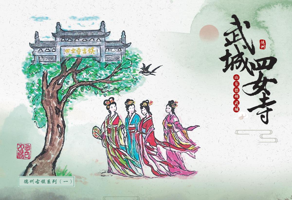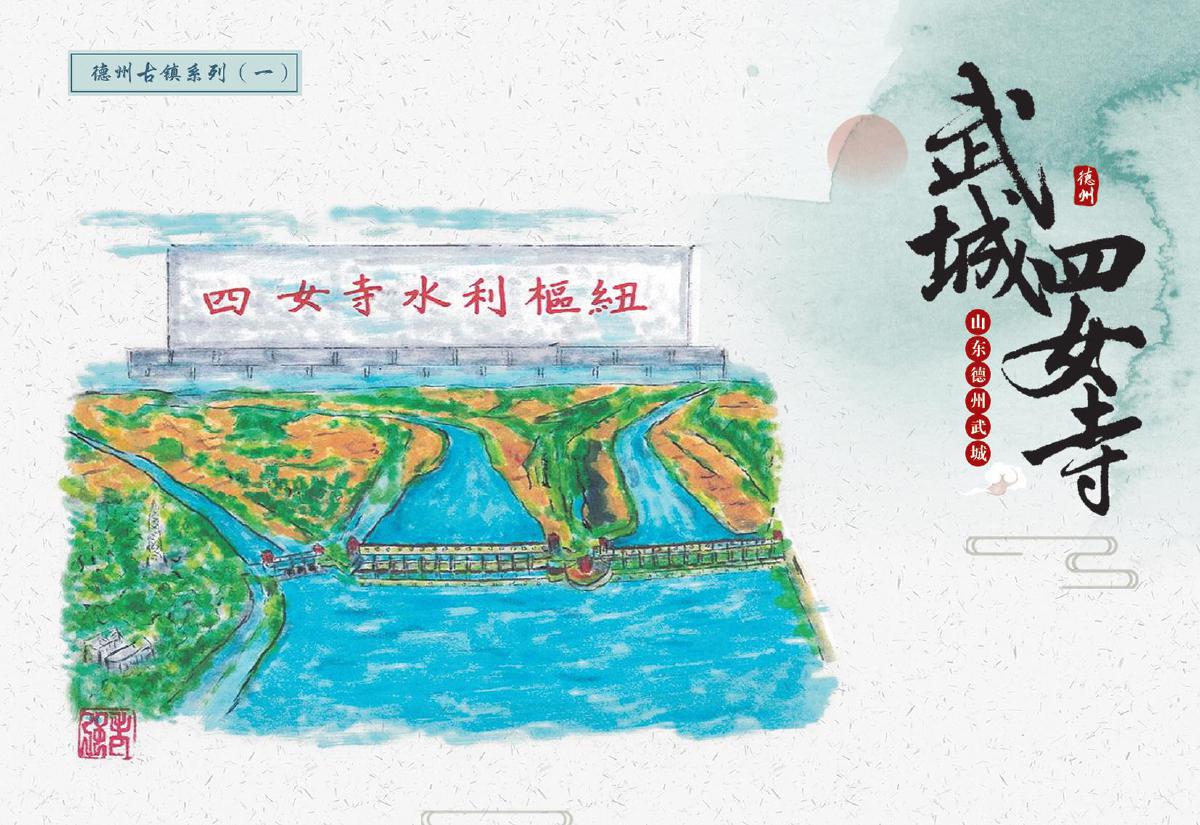 此次首發(fā)的文創(chuàng)產(chǎn)品涵蓋郵資封、明信片、郵資機宣傳戳及主題宣傳戳四大類,每一件都浸潤著四女寺的文化基因。其中,“四女”郵資封(右上圖)以工筆重彩呈現(xiàn)經(jīng)典場景:畫面中四位女子于槐樹下漫步,旁側(cè)牌坊古樸,飛鳥點綴天際,還原“四女侍親,栽槐立誓”的民間傳說,四女常伴樹側(cè),行孝事、話桑麻,樹與人相襯成景,演繹著傳統(tǒng)孝道的溫度,讓古老美德在時光里熠熠生輝,供后人感懷、傳揚;而“四女寺水利樞紐”明信片(右下圖)則通過航拍視角與細節(jié)特寫的結(jié)合,展現(xiàn)這座黃河下游重要水利工程的宏偉氣勢——堤壩蜿蜒如巨龍伏波,閘門啟閉間盡顯古人治水的智慧結(jié)晶,讓現(xiàn)代觀者得以觸摸歷史的溫度。