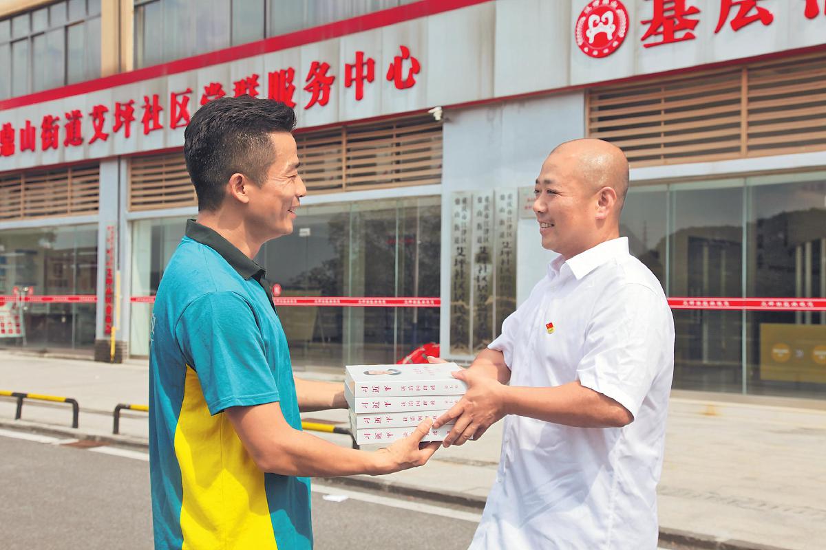 重慶市郵政分公司通過網(wǎng)點重點展示和視頻聯(lián)播宣傳,確保重大主題圖書發(fā)行工作高效推進。圖為江津郵政投遞員為鼎山街道艾坪社區(qū)及時配送《習(xí)近平談治國理政》第五卷?!跬醮禾m 崔卡 攝影報道