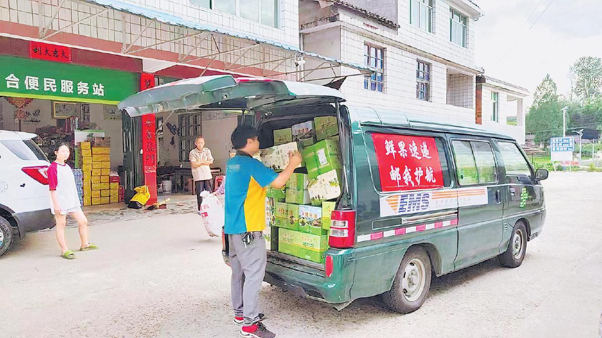 鮮桃裝好箱后,由郵政攬投員裝車運(yùn)送至最近的收寄點(diǎn)。□許經(jīng)緯 攝