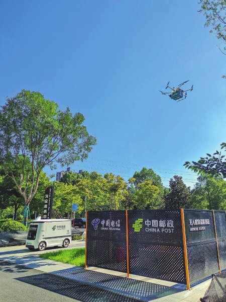 8月20日,在安徽省合肥市政務(wù)中心中國(guó)郵政無(wú)人機(jī)物流樞紐站,無(wú)人機(jī)啟程配送無(wú)人車送來的郵件。