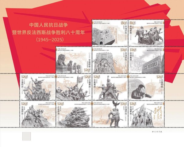 根據(jù)黨中央有關(guān)中國人民抗日戰(zhàn)爭暨世界反法西斯戰(zhàn)爭勝利80周年紀念活動安排,中國郵政于9月3日發(fā)行《中國人民抗日戰(zhàn)爭暨世界反法西斯戰(zhàn)爭勝利八十周年》紀念郵票1套13枚、小型張1枚,全套面值為20.8元。