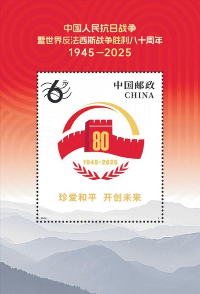小型張使用中國人民抗日戰(zhàn)爭暨世界反法西斯戰(zhàn)爭勝利80周年紀念活動標識作為主景,主要表現(xiàn)“珍愛和平、開創(chuàng)未來”。