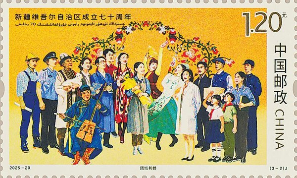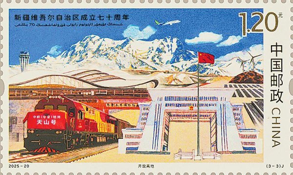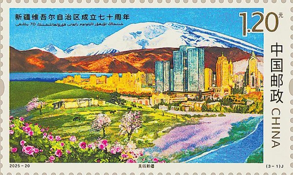 郵票圖案采用巖彩繪畫技法創(chuàng)作。第一枚“美麗新疆”,畫面主體為新疆城市美景,前景綻放的玫瑰代表塔克拉瑪干沙漠“鎖邊”工程,背景為昆侖山慕士塔格峰和卡拉庫里湖。第二枚“團(tuán)結(jié)和睦”,畫面表現(xiàn)了新疆各民族、各行業(yè)群眾團(tuán)結(jié)和諧、親如一家的場景。第三枚“開放高地”,畫面以中歐班列、霍爾果斯國門為主體,遠(yuǎn)景展現(xiàn)了烏魯木齊國際機(jī)場、光伏電站和博格達(dá)峰。郵票充分展現(xiàn)了在新疆這片美麗、廣袤的土地上,傳統(tǒng)與現(xiàn)代交織,自然與人文共生,古老與青春共舞;生動描繪了各族群眾獲得感、幸福感、安全感不斷增強(qiáng)的美好圖景,各族群眾像石榴籽一樣緊緊抱在一起,在中國式現(xiàn)代化進(jìn)程中更好建設(shè)團(tuán)結(jié)和諧、繁榮富裕、文明進(jìn)步、安居樂業(yè)、生態(tài)良好的美麗新疆。
