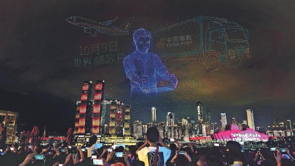 10月4日20時30分,重慶市南濱路上空,一場以第56屆世界郵政日為主題的無人機燈光秀璀璨上演。數(shù)千架無人機以天為幕,在長江上空編織出郵遞員風雨無阻、使命必達,郵政金融員工溫馨服務、連接美好以及重慶地標明信片詮釋山河情誼的影像?,F(xiàn)場,來自全國各地的游客及重慶市民駐足觀看,紛紛用手機拍下這精彩瞬間。孩子們指著天空歡呼:“看,天上有郵遞員在飛!”這場科技與溫情交融的視覺盛宴,展現(xiàn)了中國郵政的現(xiàn)代化形象,讓群眾在節(jié)日的歡樂中感受到郵政服務的溫度與堅守。
