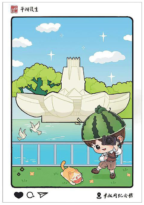 在項目推進過程中,設計團隊與平湖市委宣傳部進行了多輪溝通,最終獲得政府層面的認可與支持。設計構思上,團隊深入挖掘平湖地方文化資源,注重將城市肌理與精神符號融入方寸之間。彩戳及手繪明信片的圖案不僅選取了當?shù)卮硇跃坝^,更著重突出了與一代文化巨擘李叔同相關的元素,如作為城市文化新地標的東湖李叔同紀念館。該紀念館于今年5月完成升級并重新開放,成為集中展示李叔同生平與藝術成就的重要窗口,也為彩戳、手繪明信片設計提供了豐富的視覺素材和內(nèi)涵支撐。手繪明信片還融入了卡通人物形象,貓咪與戴西瓜帽的動漫人物形象活潑俏皮,細節(jié)處滿是巧思。