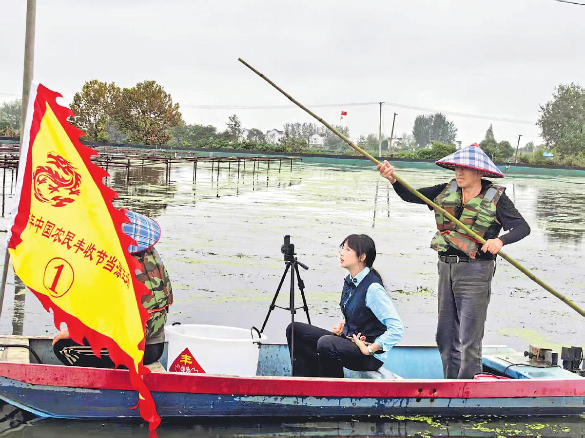 郵政在蟹塘邊開(kāi)展直播,助力螃蟹銷(xiāo)售。