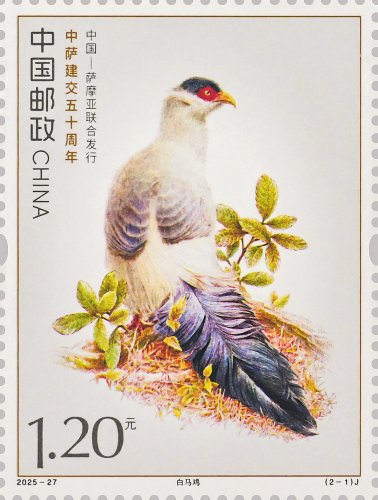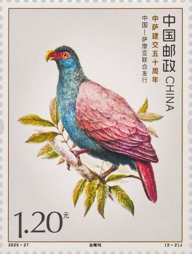 本套郵票以兩國的特色鳥類為核心設(shè)計(jì)元素,融西方鋼筆線條與東方淡彩的表現(xiàn)技法,筆觸細(xì)膩傳神,形象生動(dòng)逼真,兩只禽鳥顧盼相應(yīng)、神氣貫連,洋溢著蓬勃的生命力。本套郵票既展現(xiàn)兩國獨(dú)特的自然生態(tài)之美,更傳遞出兩國友誼的深厚底蘊(yùn)與美好未來。第一枚郵票表現(xiàn)了白馬雞。作為四川丹巴莫斯卡鳥類重要棲息地的主要保護(hù)物種,白馬雞也成為丹巴自然生態(tài)的鮮活代表,當(dāng)?shù)鬲?dú)特的高原氣候、適宜的生態(tài)環(huán)境為其提供了理想生存空間。第二枚郵票表現(xiàn)了齒嘴鳩。作為薩摩亞的本土特有鳥類,齒嘴鳩不僅是當(dāng)?shù)厣鷳B(tài)系統(tǒng)的重要成員,更被視為薩摩亞自然與文化遺產(chǎn)的象征,承載著薩摩亞人民對家鄉(xiāng)土地的熱愛與珍視。