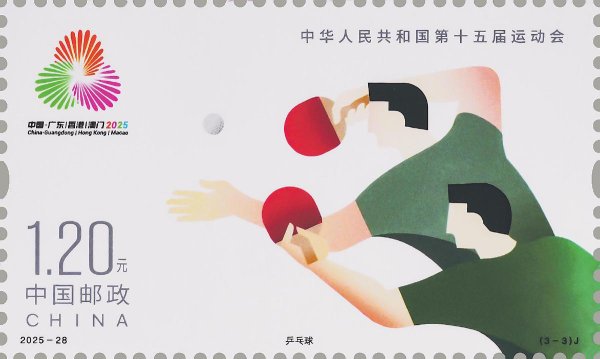 第十五屆全運(yùn)會是粵港澳三地承辦的我國規(guī)模最大、水平最高、影響最廣的綜合性運(yùn)動(dòng)會,也是香港、澳門首次承辦全國運(yùn)動(dòng)會。該套郵票由內(nèi)地、港、澳三地設(shè)計(jì)師韓家英、陳幼堅(jiān)、歐俊軒設(shè)計(jì)。第1枚郵票表現(xiàn)內(nèi)容為花樣游泳,郵票圖案以躍動(dòng)的剪影表現(xiàn)運(yùn)動(dòng)員的優(yōu)雅身姿,力與美相生共舞,以獨(dú)特的視角展現(xiàn)出運(yùn)動(dòng)員在水中的靈動(dòng)瞬間。第2枚郵票表現(xiàn)內(nèi)容為擊劍,郵票圖案以飛動(dòng)的線條表現(xiàn)運(yùn)動(dòng)員迅猛矯健的身姿,剛與柔交織碰撞,以極簡的構(gòu)圖展現(xiàn)出運(yùn)動(dòng)員激烈的對抗場景。第3枚郵票表現(xiàn)內(nèi)容為乒乓球,郵票圖案以鮮明簡練的色塊表現(xiàn)運(yùn)動(dòng)員蓄勢待發(fā)的專注之姿,強(qiáng)與韌相融并濟(jì),以幾何化、概括化的現(xiàn)代極簡插畫造型,展現(xiàn)出運(yùn)動(dòng)員發(fā)球瞬間的氣勢和張力,營造出緊張的比賽氛圍。