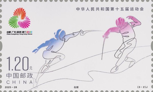 中國郵政定于11月9日發(fā)行《中華人民共和國第十五屆運(yùn)動(dòng)會》紀(jì)念郵票1套3枚,郵票圖案名稱分別為花樣游泳、擊劍、乒乓球。全套郵票面值3.60元,計(jì)劃發(fā)行數(shù)量為套票500萬套、版式二69.3萬版。