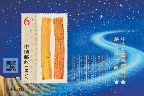 小型張圖案表現(xiàn)了“黑夫木牘”。該木牘1975年出土于湖北省云夢縣睡虎地4號秦墓,是目前考古發(fā)現(xiàn)的最早家書,延續(xù)了中華全國集郵聯(lián)合會大會系列郵票以郵驛文化元素為表現(xiàn)內(nèi)容的慣例。該家書由士兵黑夫與驚寫給兄長衷,信中講述了一些從軍細節(jié),還有對家人的關(guān)懷及衣物錢糧的需求。邊飾背景中展開的竹簡似一條時光長河,在象征中華文明的浩瀚星空里蜿蜒伸展,穿越千年、對話古今,蘊含了中華文明在傳承中創(chuàng)新、在創(chuàng)新中發(fā)展的思想智慧。